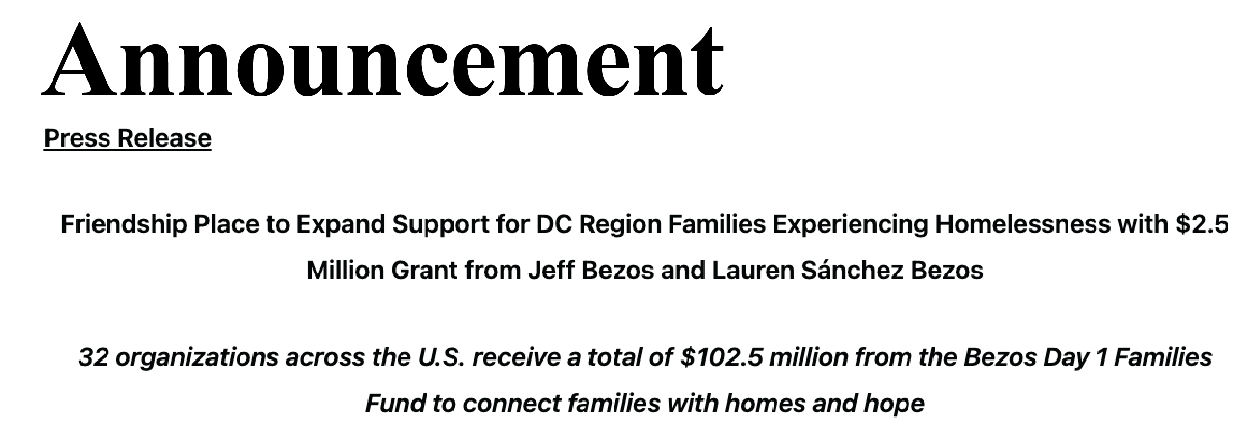 Press Release Friendship Place to Expand Support for DC Region Families Experiencing Homelessness with $2.5 Million Grant from Jeff Bezos and Lauren Sánchez Bezos 32 organizations across the U.S. receive…